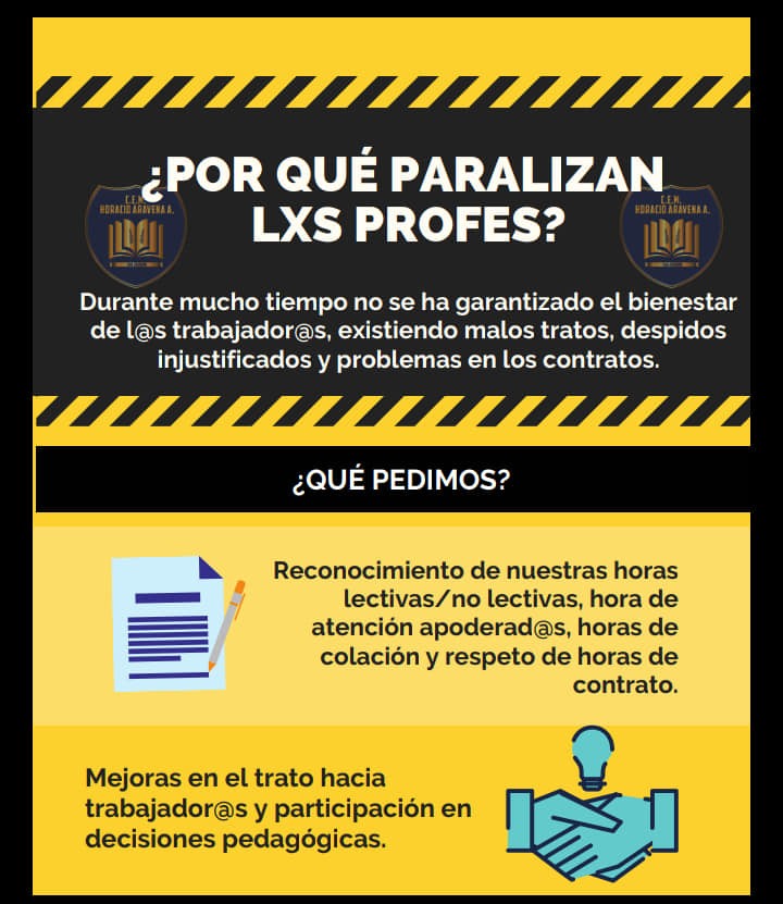 Existe una serie de exigencias de parte de las y los trabajadores del establecimiento, dirigidas a ejes como la mejora del clima laboral y, a la vez, de las condiciones laborales y de espacios de diálogos pedagógicos. Asimismo, plantean la importancia de dar cumplimiento a los contratos y dictámenes, estos últimos referidos a la distribución de horas lectivas y no lectivas, a lo que se suma el generar acciones que terminen, concretamente, con el agobio y malos tratos que acusan las y los docentes.