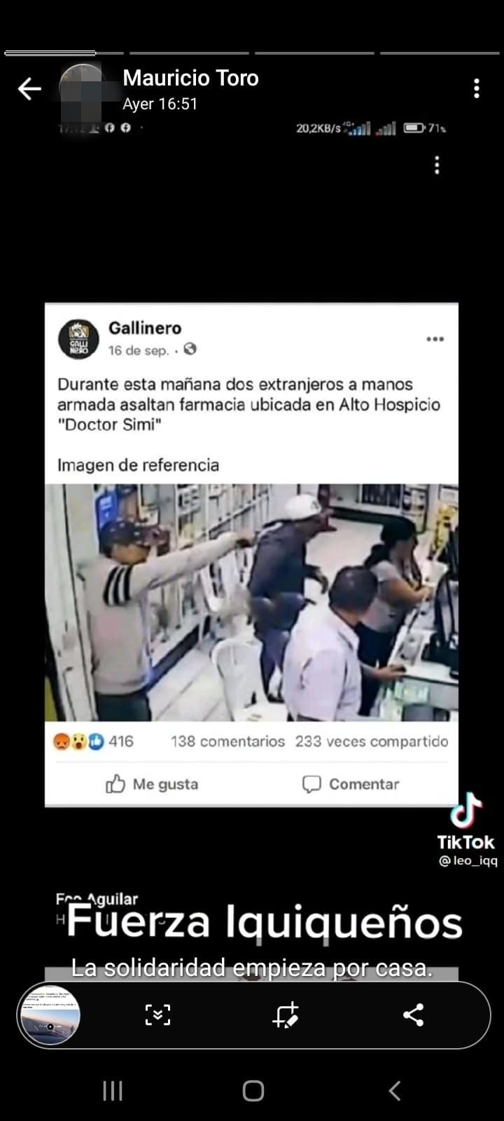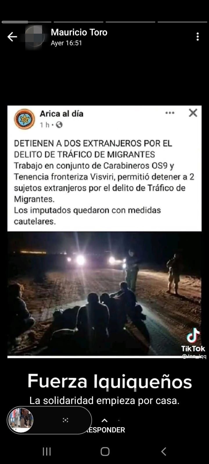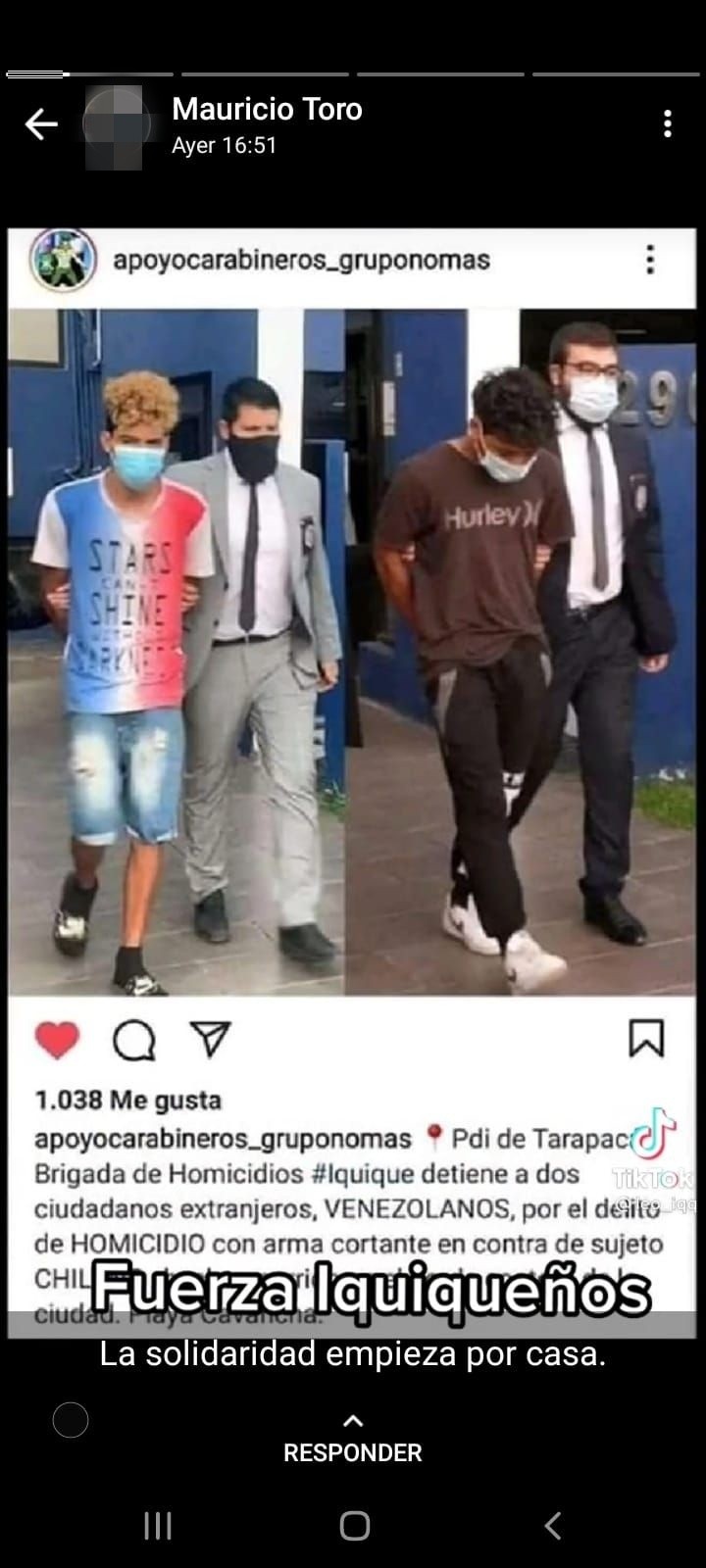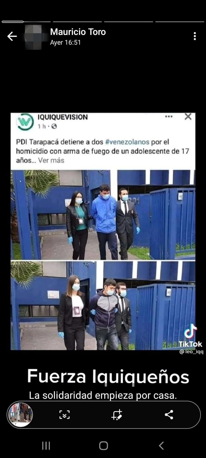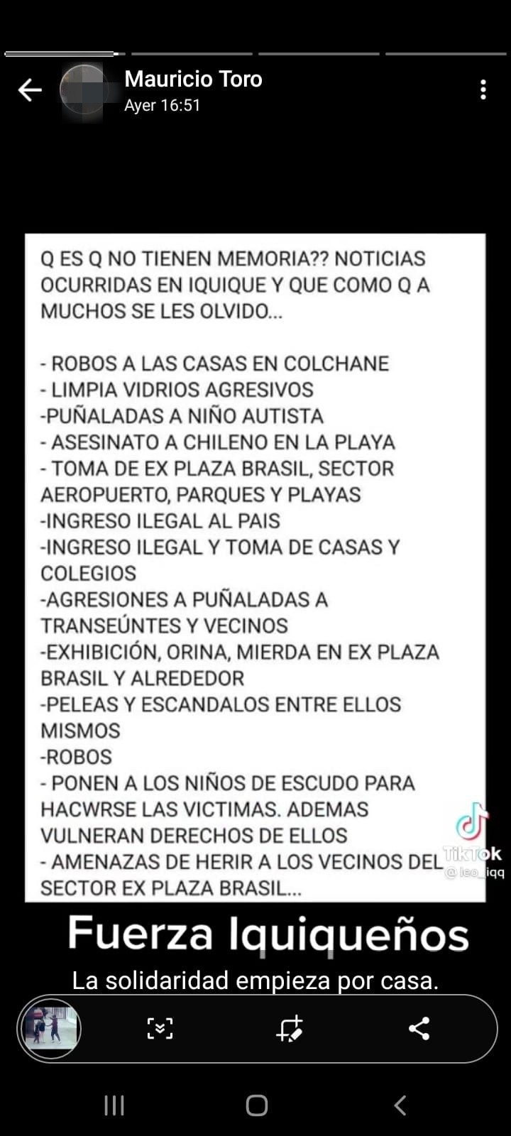 1. En primer lugar aclarar que jamás he sido antiinmigrante ni he escrito nada contra los inmigrantes, ya que mi propia familia es inmigrante y yo soy bisnieto de inmigrante. Mi bis abuelo llegó desde Europa en un período muy crítico del continente y en Chile pudo encontrar el refugio y la posibilidad de desarrollarse y ser un aporte para el país. Chile es un país de inmigrantes y entre todos aportamos a la cultura de nuestra patria para el bien de nuestra nación. Pido las disculpas del caso si lo que compartí fue ofensivo para algún integrante de la comunidad y me comprometo a no repetir esta acción de compartir estos videos (de tik tok, entre otros).