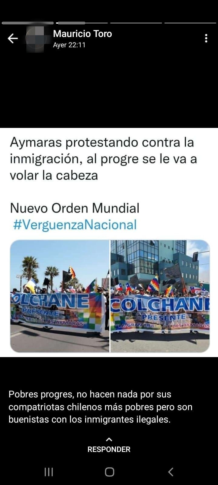 Utilizando sus estados de WhatsApp en su teléfono -el mismo contacto que manejan miembros de su comunidad educativa- el director de la Escuela Bélgica de Chiguayante, Mauricio Alejandro Toro Arosteguy, ha compartido distintos mensajes de odio relacionados con lo sucedido en Iquique que han llamado la atención de la comunidad educativa y que contradice los requerimientos profesionales establecidos por la normativa legal para ocupar este cargo.