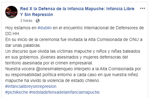 [resumen.cl] Durante una presentación de la alta comisionada de la ONU para Los Derechos Humanos, Michelle Bachelet, en un encuentro de internacional de defensores de DDHH en Dublín, Irlanda, una dirigente de una organización en defensa de infancia mapuche la interpeló por los episodios niños y niñas mapuches baleados y jóvenes asesinados en sus gobiernos, que no han sido parte de su discurso.