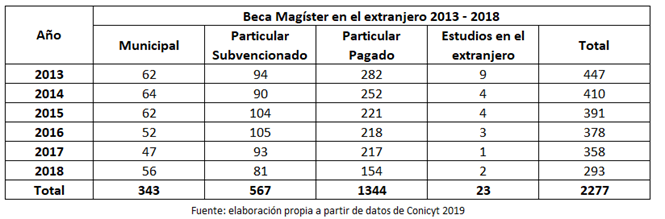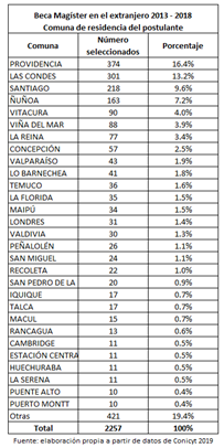 Los datos de la cuenta son decidores cuando nos muestra el origen de los y las becadas para estudios de maestría en el extranjero para 2019, una ínfima minoría proviene de la educación municipal, donde sabemos estudia la población más carencia social y económicamente del país.