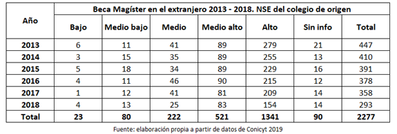 Por otra parte, y considerando un consolidado entre 2013 y 2018, al medir el origen por nivel socioeconómico la cifra es aterradora, el 82% de las becas estatales para estudios de maestría en el extranjero son para los grupos medio alto y alto, un desequilibrio inaguantable para un país como Chile, altamente movilizado en las últimas décadas por una educación más justa.