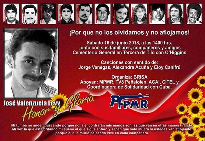 Compañero José Joaquín Valenzuela Levi, hoy estamos aquí frente a ti y a través tuyo simbolizamos éste homenaje a todas y todos los caídos los días 15 y 16 junio de 1987, queda la presencia de nuestros compañeros que murieron caminando hacia la libertad de Chile, hoy cada uno y una están enteros, ejemplos de vida, semilla y utopía hecha realidad, líderes que inspiran a muchos y muchas, corazones de amor incrustados en la justicia que se levanta buscando el sol. Hoy los recordamos sin llantos, ya que son ejemplo de consecuencia viva, están en cada palabra, en cada acto que se realizan en sus nombres, siguen vivos en cada hombre y mujer que replican sus acciones.