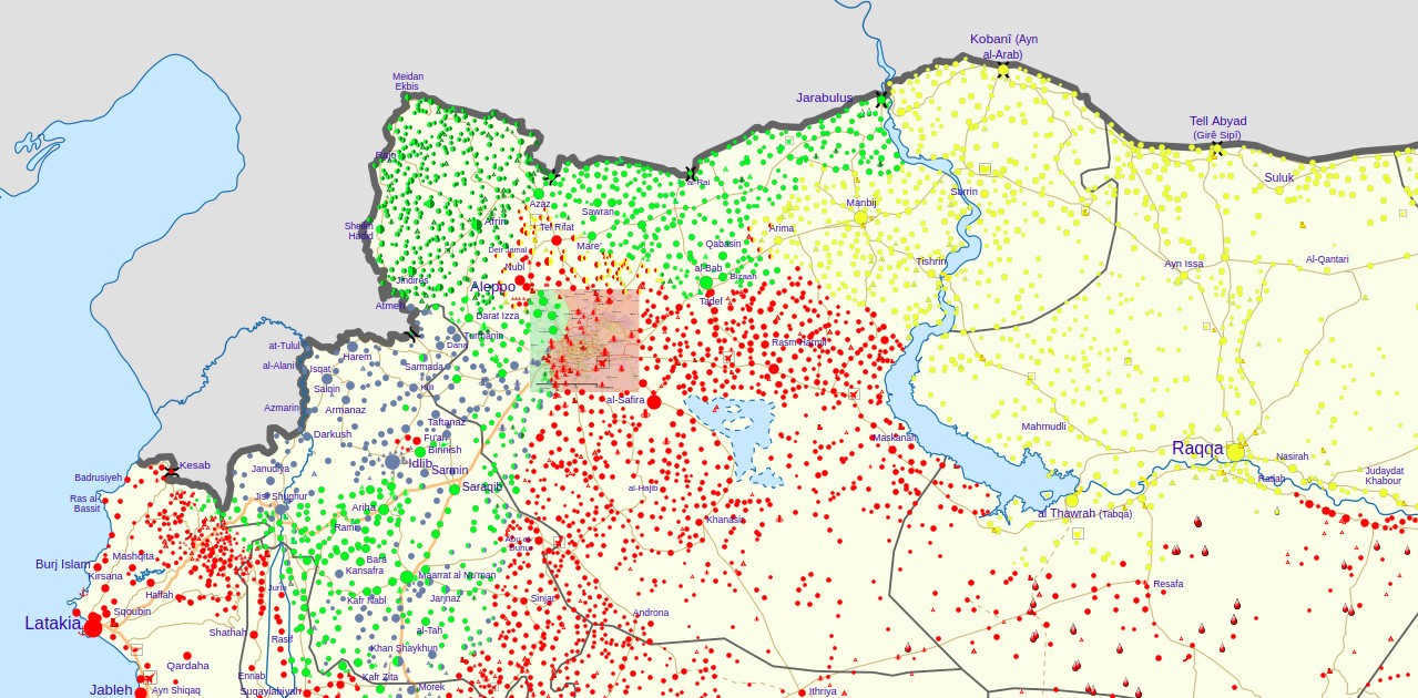 En rojo: Gobierno sirio. En verde: Oposición siria (verde oscuro indica mercenarios con apoyo de Turquía y efectivos del ejército turco). En amarillo: Fuerzas Democráticas Sirias (incluyen a las YPG-YPJ kurdas). En gris: grupo Tahrir al-Sham. En negro: Estado Islámico (Daesh). Fuente: https://en.wikipedia.org/wiki/Template:Syrian_Civil_War_detailed_map