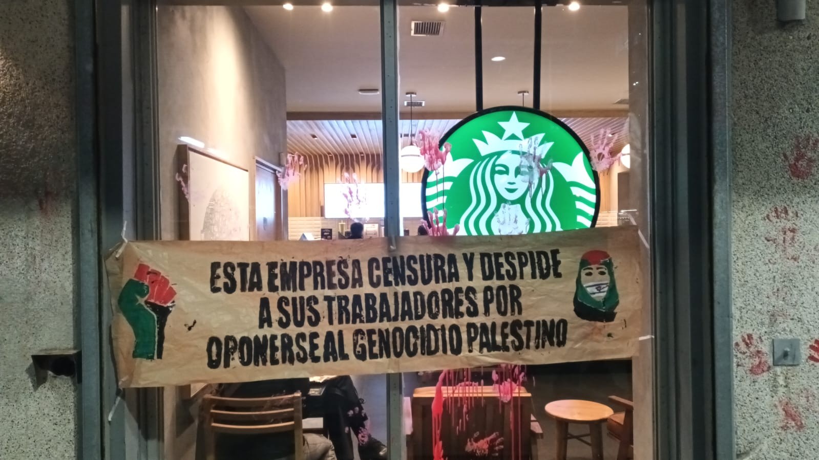 En la esquina de Barros Arana y Caupolicán, se produjo una intervención en contra de la cafetería Starbucks, por la colaboración de la marca multinacional con el régimen sionista que hoy ejecuta un genocidio contra el pueblo palestino y que ha dejado más de 34 mil personas asesinadas, 12 mil de ellos son niñas y niños.