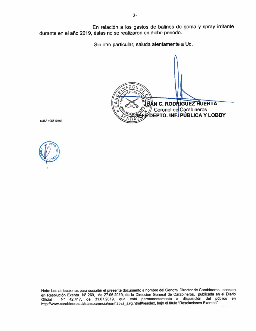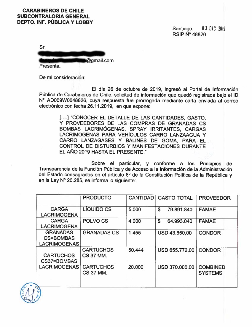Si bien Carabineros descarta haber comprado “en dicho periodo” balines de goma y spray irritante, si enviaron un listado de las compras de la totalidad del periodo de cargas lacrimógenas CS (clorobenzilideno malononitrilo) en líquido (para el carro lanza-agua o “guanaco”), en polvo (utilizado por el carro lanzagases o “zorrillo”), granadas CS de mano, y cartuchos CS de 37mm para lanzagranadas.