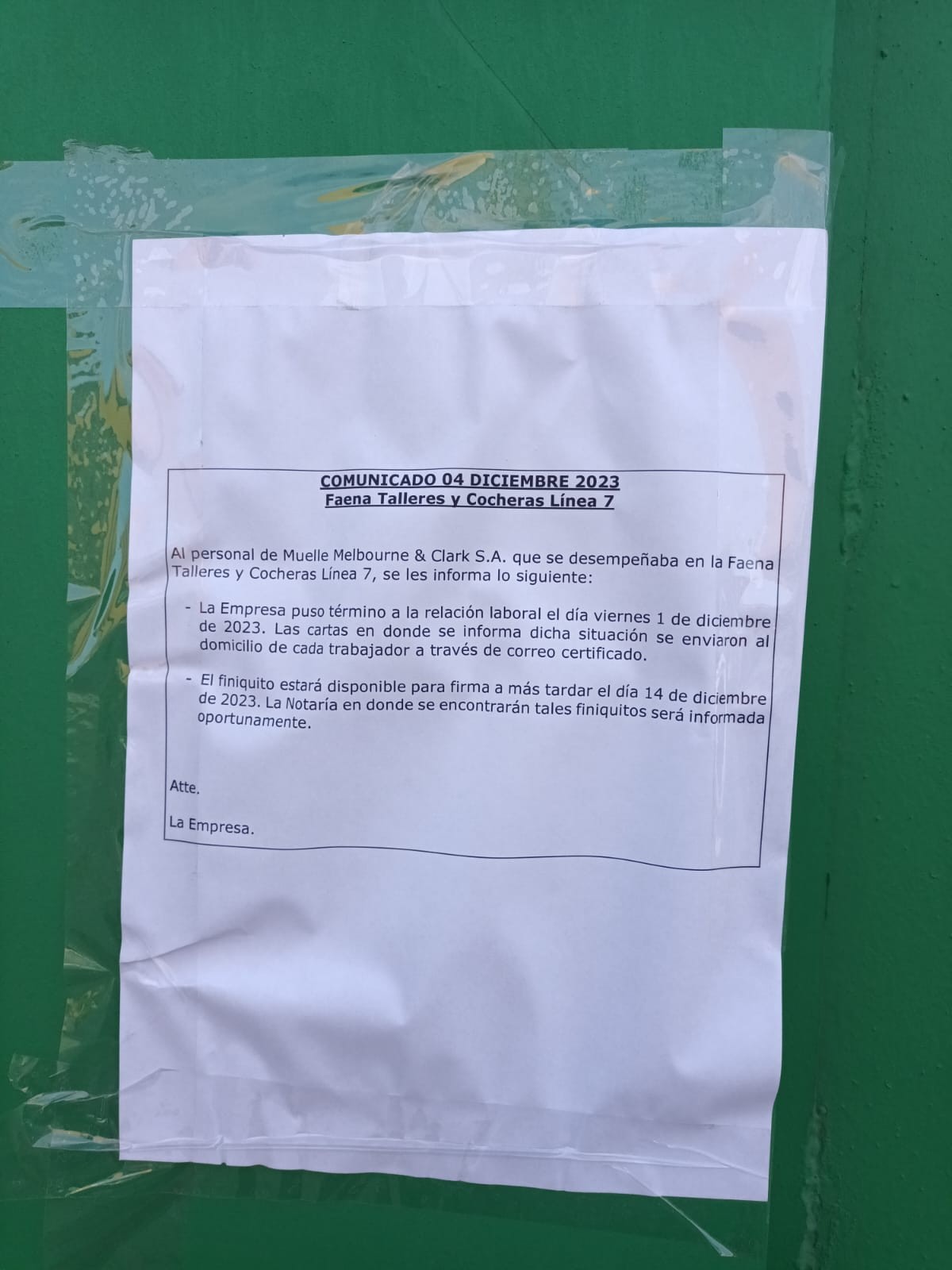 A lo anterior, el trabajador agrega que, «este lunes nos encontramos con la sorpresa de que la faena se encontraba completamente cerrada, con resguardo, con maquinaria retirada y sin presencia del empleador. Al mismo tiempo, nos fijamos que habían pegado un comunicado a las afueras del trabajo, diciendo que a todos los trabajadores de la faena de Talleres y Cocheras íbamos a ser desvinculados. Así nos enteramos. El documento decía que se nos iba a enviar a todos una carta de despido con nuestro finiquito, pero no todos los trabajadores han sido notificados hasta la fecha».