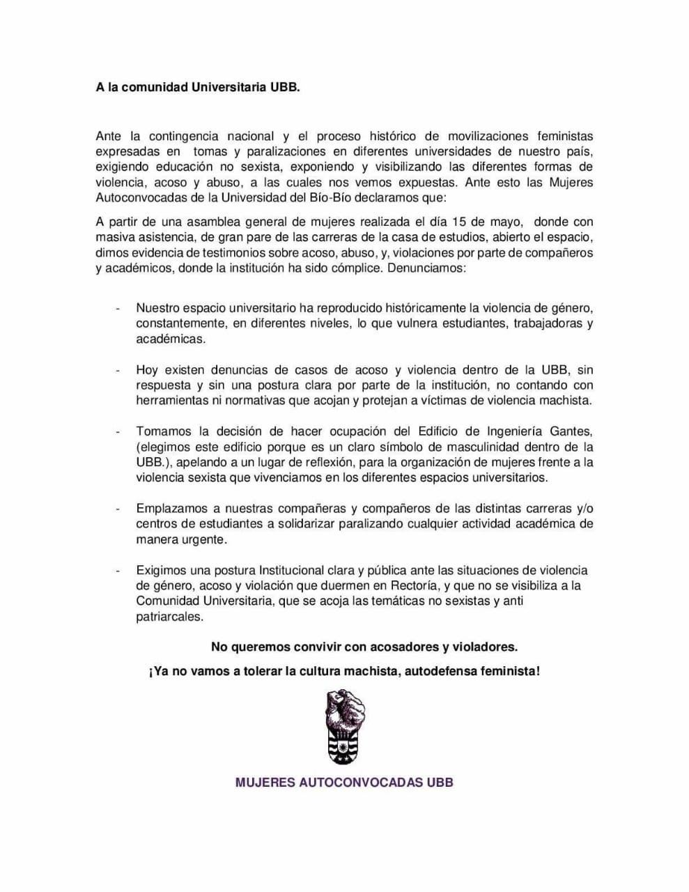 Las miembros de la institución educativa, decidieron la acción tras una histórica asamblea de mujeres en la Universidad del Bío Bío realizada el 15 de marzo, donde se evidenciaron una serie de prácticas machistas y casos de abusos, acosos sexuales y violaciones protagonizados por estudiantes y académicos de la Universidad.