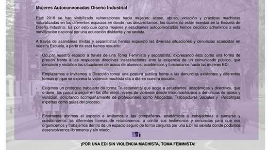 En tanto las protagonistas de la toma de Diseño Industrial exigen “un protocolo trabajado de manera triestamental que acoja a estudiantes, académicos y directivos, que ordene los pasos a seguir en los diferentes niveles de violencia desde micromachismos a denuncias de acoso y violación, solicitando acompañamiento de profesionales como abogadas, trabajadores sociales y psicólogas expertas como guías de proceso.”