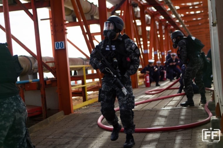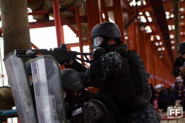 Manifestantes avanzaron por la playa de Ventanas y los efectivos de la policía marítima de la Armada les dispararon balines desde el muelle industrial de Oxiquim, además de arrojarles agua con una manguera a presión.