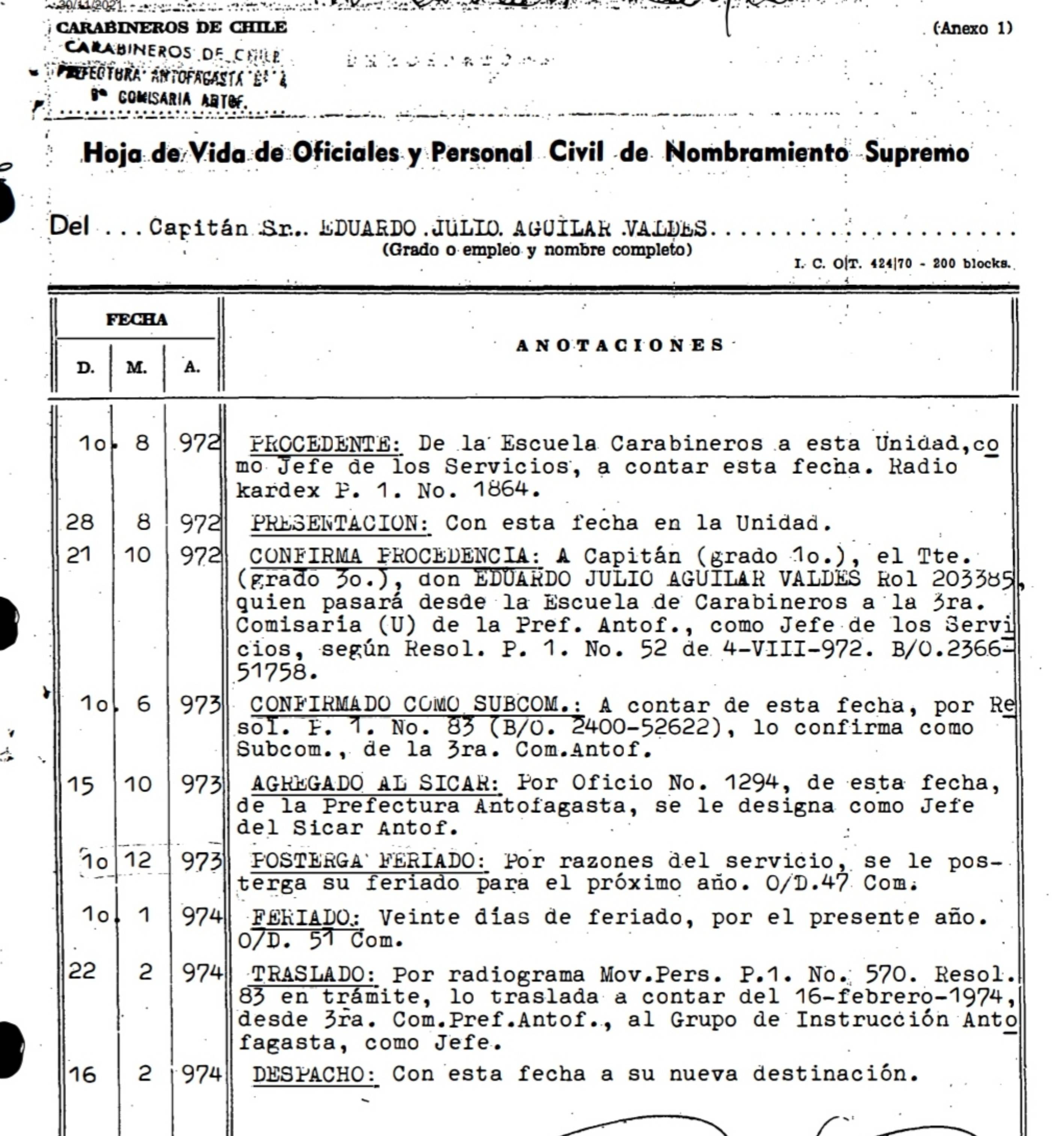 Hoja de vida Eduardo Aguilar Valdés. Jefe del SICAR Antofagasta. Fuente: Expediente Causa 3-2011.