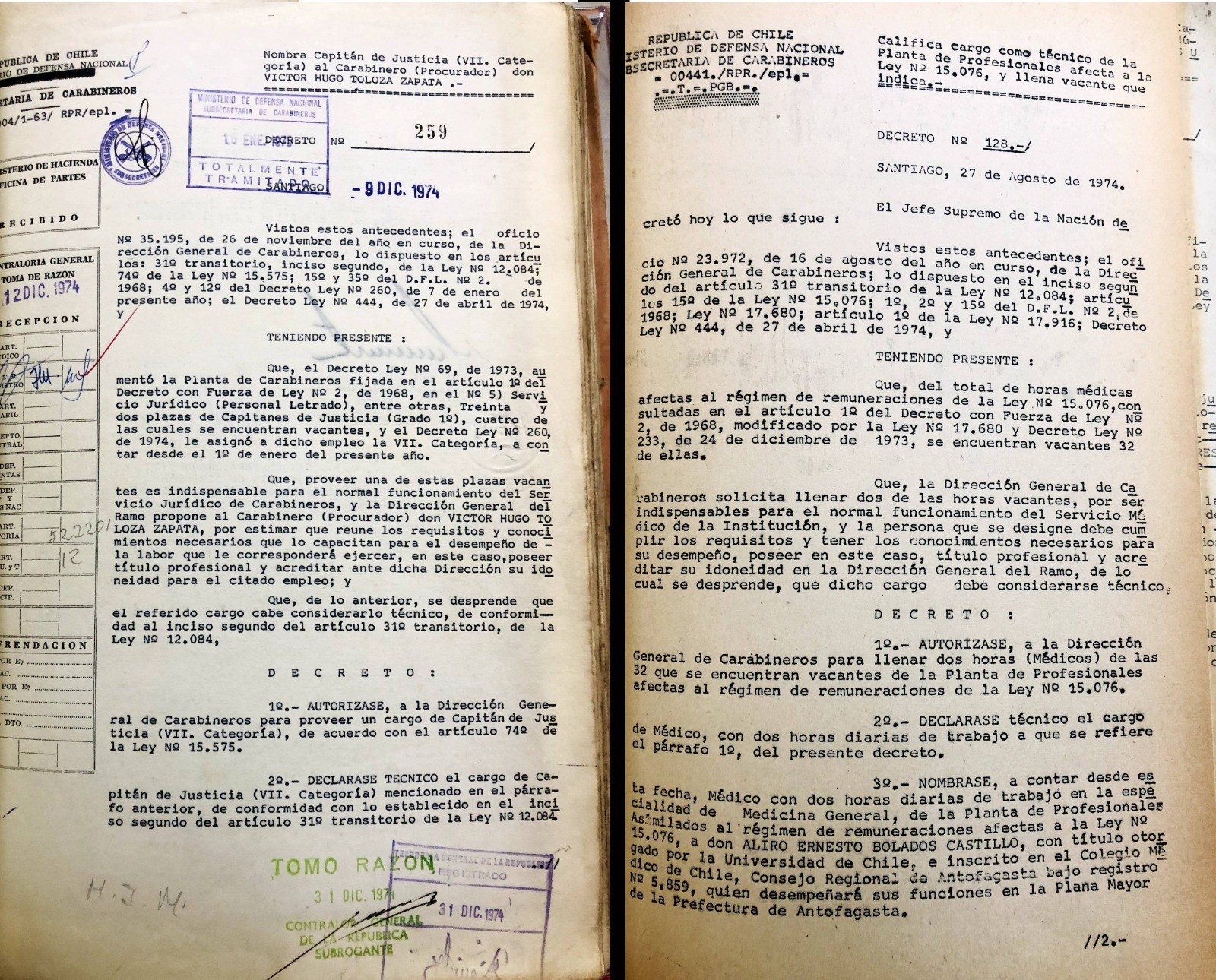 Nombramiento de Médico General (27-08-1974) y Capitán de Justicia (09-12-1974). Fuente: Subsecretaría de Carabineros; ARNAD.