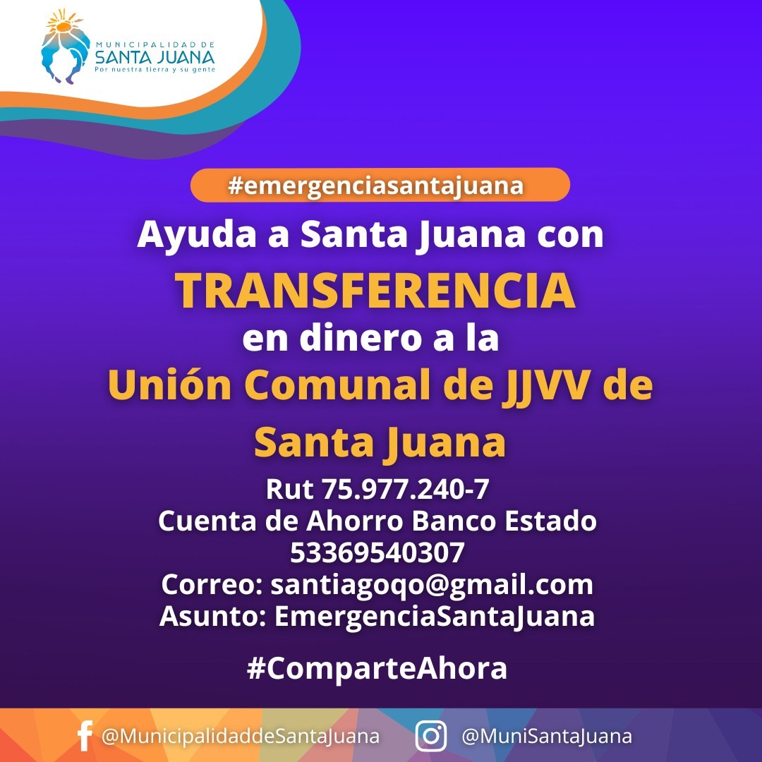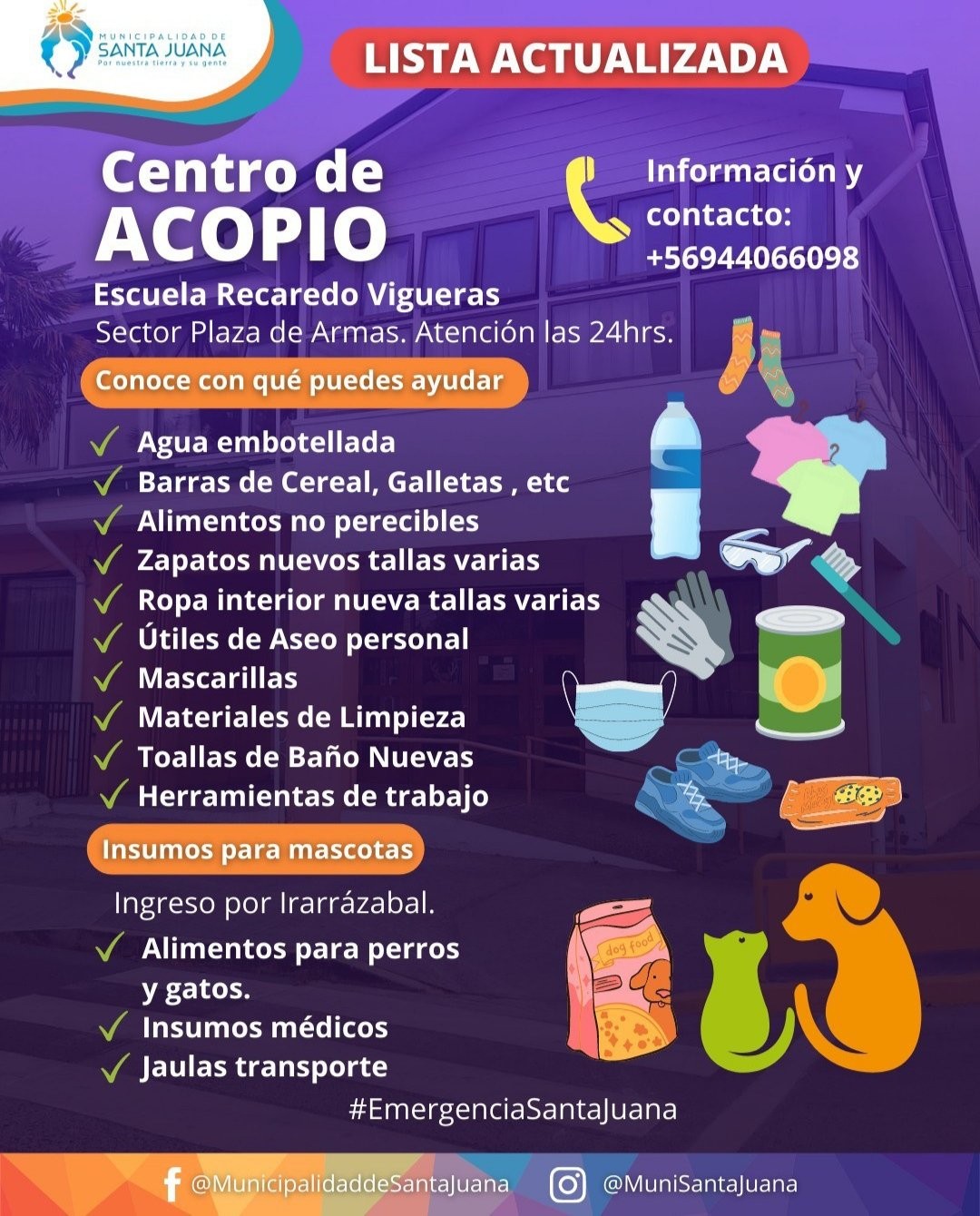 La Municipalidad de Santa Juana está organizando un centro de acopio en la Escuela Revaredo Vigueras, en la plaza de la comuna, con listado de necesidades que se va actualizando sistemáticamente.