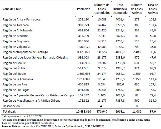 La siguiente tabla muestra el número de casos y tasa de incidencia de casos COVID-19 según región de residencia en Chile, con fecha al 29 de octubre de 2020.