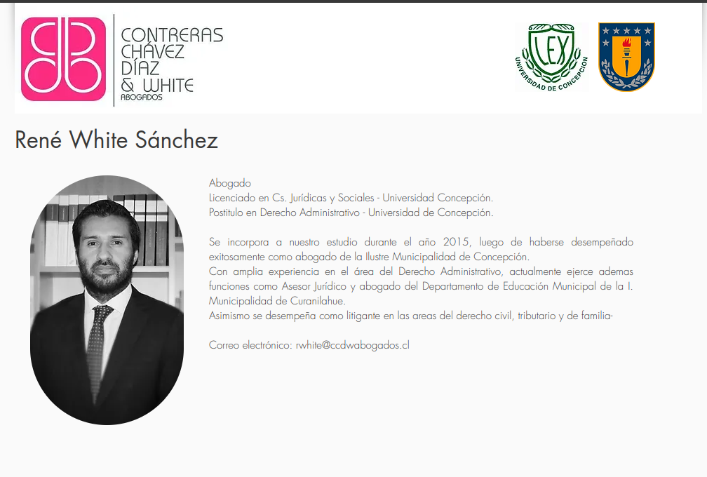 Según la página web del estudio de abogados, René White Sánchez se sumó a la empresa el año 2015, donde señala también que fue funcionario de la Municipalidad de Curanilahue.