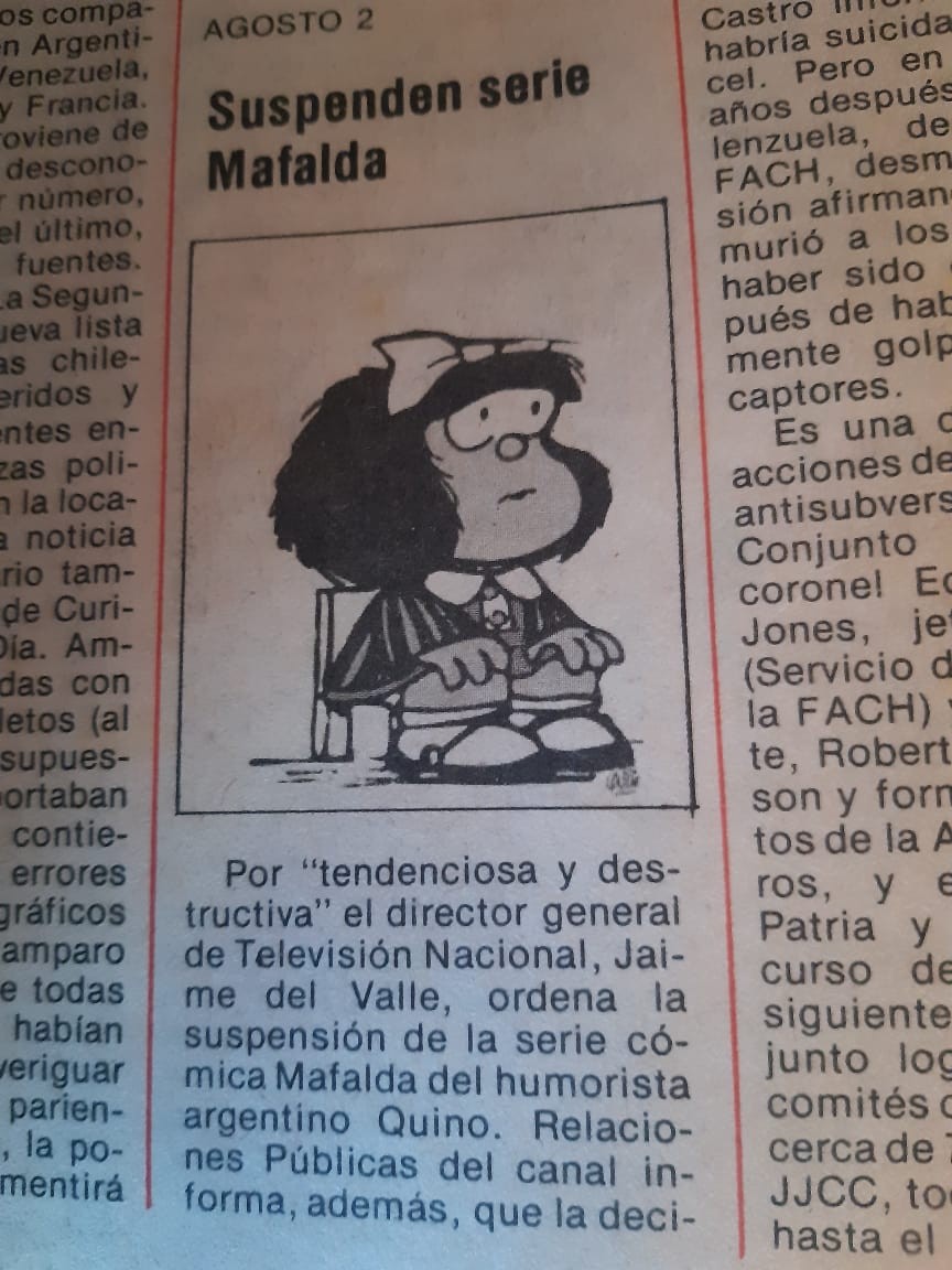 En el caso chileno, fue el 2 de agosto de 1975, asegura la revista Análisis, que se suspendió el tiraje cómico de Mafalda en el país.