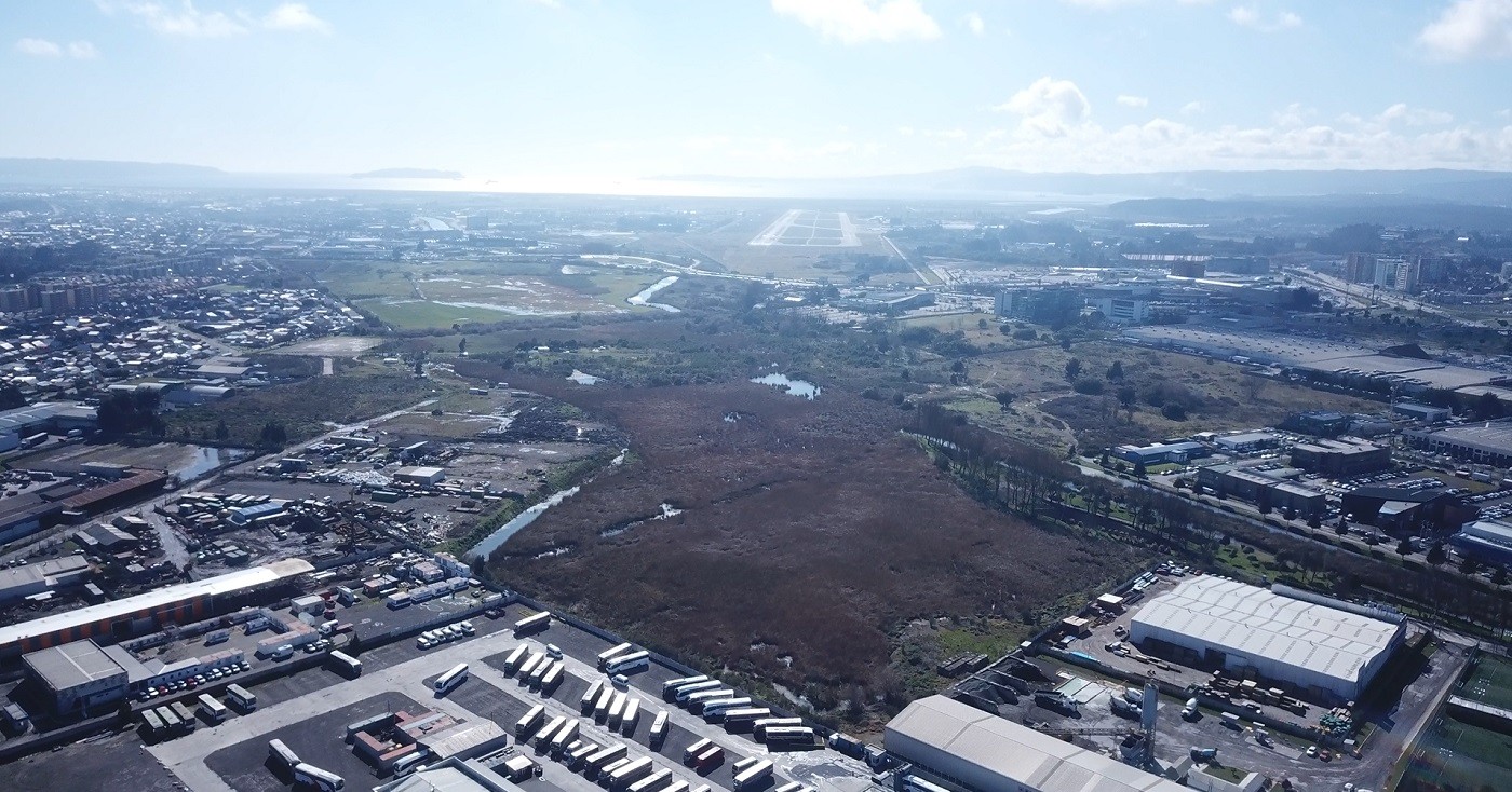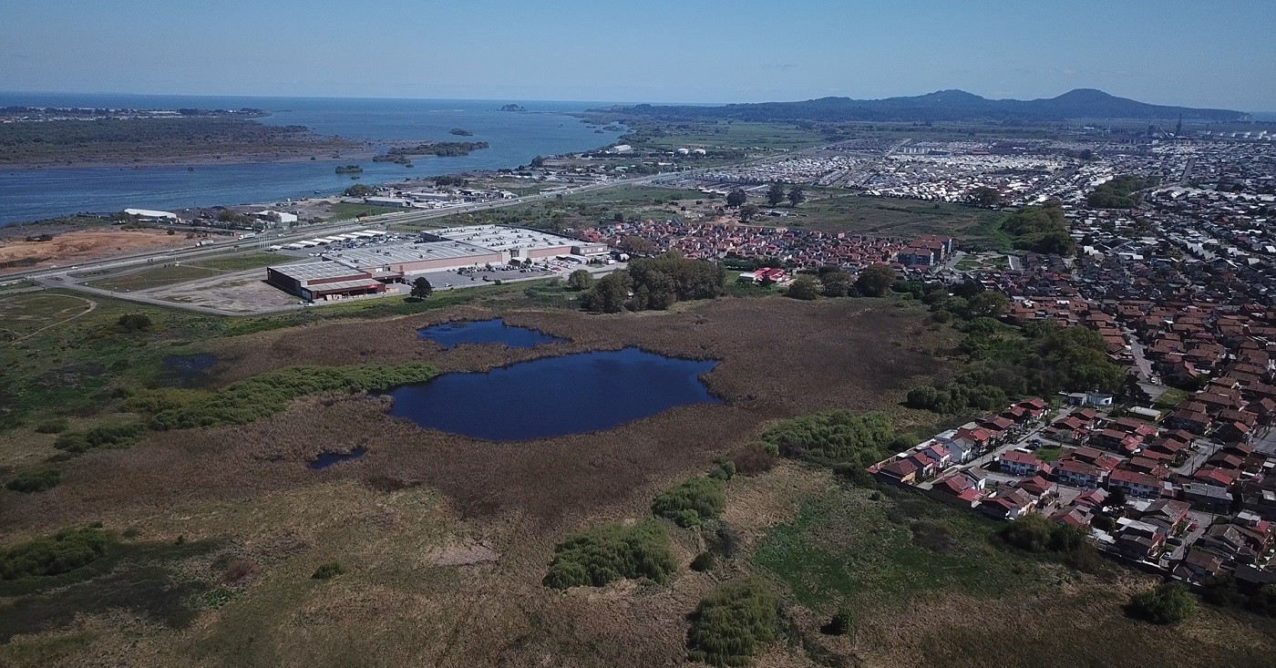 Imagen muestra Humedal Vasco de Gama cada vez más restringido por la expansión urbana e industrial, comuna de Hualpén, Gran Concepción