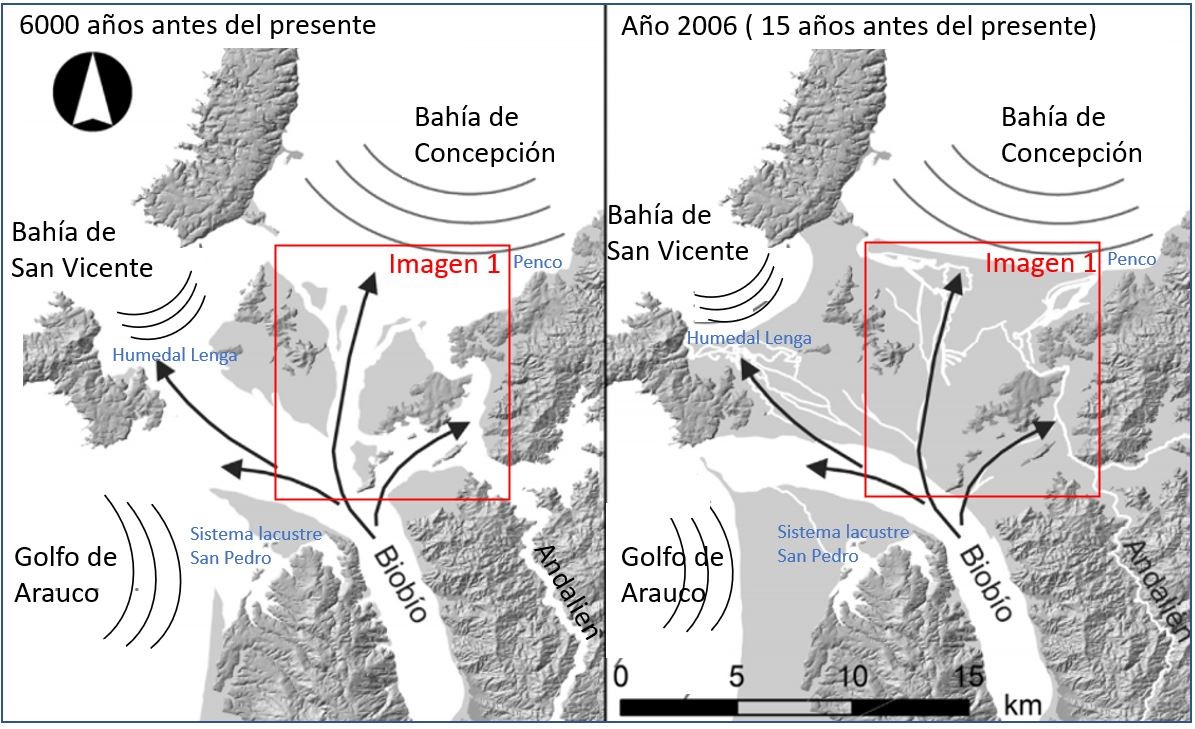 Isla y su equipo en el año 2012, publicó un estudio que demuestra que el nivel del mar hace 6000 años estaba cerca de 5 metros más alto de lo que está hoy, inundando gran parte de las zonas planas. En la imagen 2, modificada de Link y su equipo (2019), se observa que la desembocadura del Biobío, descargaba sus aguas hacia el océano en cuatro direcciones, hacia al Golfo de Arauco (como lo hace actualmente), a la bahía de San Vicente a través del actual humedal Lenga, hacia la bahía de Concepción a través del corredor de humedales que es objetivo de este reportaje, y hacia el río Andalién por sobre el valle de la Mocha.