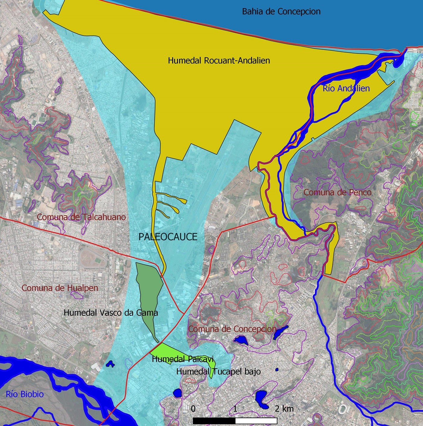 Imagen 1 (basado en Link y sus colaboradores, 2019) Aproximación área original del brazo antiguo (Paleocauce en verde agua) del Río Biobío que desemboca en la bahía de Concepción cruzando la cuidada en dirección norte y con cerca del 50% de su superficie invadido por la urbanización . Se muestran los polígonos prioritarios de la estrategia regional de conservación del Ministerio de Medio Ambiente para los distintos fragmentos y nombres del humedal según la comuna en que están ubicados, división comunal en rojo. (Verde limón fragmento Paicavi-Tucapel Bajo en Concepción; Verde opaco fragmento Vasco da Gama en Hualpén; Amarillo fragmento Rocuant-Andalien en Talcahuano y Penco)