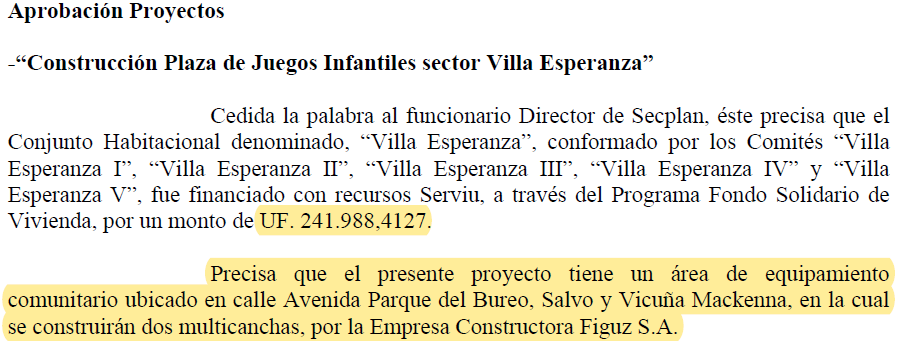 En esta, se da cuenta que la empresa se encuentra a cargo de la construcción de dos multicanchas en Villa Esperanza.
