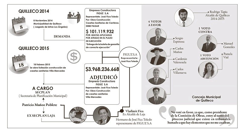 Sin embargo, durante la administración del alcalde Rodrigo Tapia Avello (PPD), en la Municipalidad de Quilleco, se le adjudicó una licitación "por $ 3.968.236.868 a la misma empresa que tiene una demanda, es decir, a la Constructora Figuz S.A, único oferente de la licitación", por la construcción de otras casetas sanitarias, esta vez en la localidad de Villa Mercedes, expresa el reportaje.