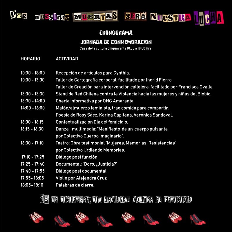 Tengo entendido que éste Jueves 19 de Diciembre están organizando una Jornada de Conmemoración llamada “Por nuestras muertas será nuestra lucha”, ¿Nos puedes contar más sobre la Jornada? ¿Qué organizaciones o individualidades participan? ¿Qué actividades habrá? ¿A qué público está dirigido? ¿Y cuál es el horario?