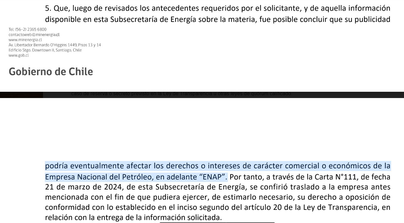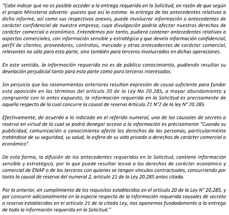 En su respuesta, el organismo indicó que tras la revisión de antecedentes y con la información disponible de la Subsecretaría, "fue posible concluir que su publicidad podría eventualmente afectar los derechos o intereses de carácter comercial o económicos de la Empresa Nacional del Petróleo". En este sentido, el organismo envió una misiva a ENAP para poder "ejercer, de estimarlo necesario, su derecho a oposición". Ante esto, Francisca Domínguez Meza, Gerente Corporativo Legal de ENAP, presentó la posición de la empresa sobre la solicitud.