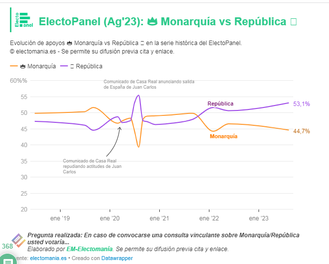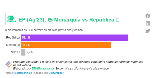 Sin embargo, hay quienes se han atrevido a medir el apoyo a la monarquía o su reemplazo por una república en la sociedad española, desde julio del 2018 la consultora Electomania ha venido desarrollando encuestas en este ámbito y la última de ellas revela resultados muy llamativos, ya que el 53,1% de los encuestados se manifestó a favor de un cambio de régimen político en el estado español, por sobre un 44,7% que aún prefiere la Monarquía y solo un 2,2% que no responde.