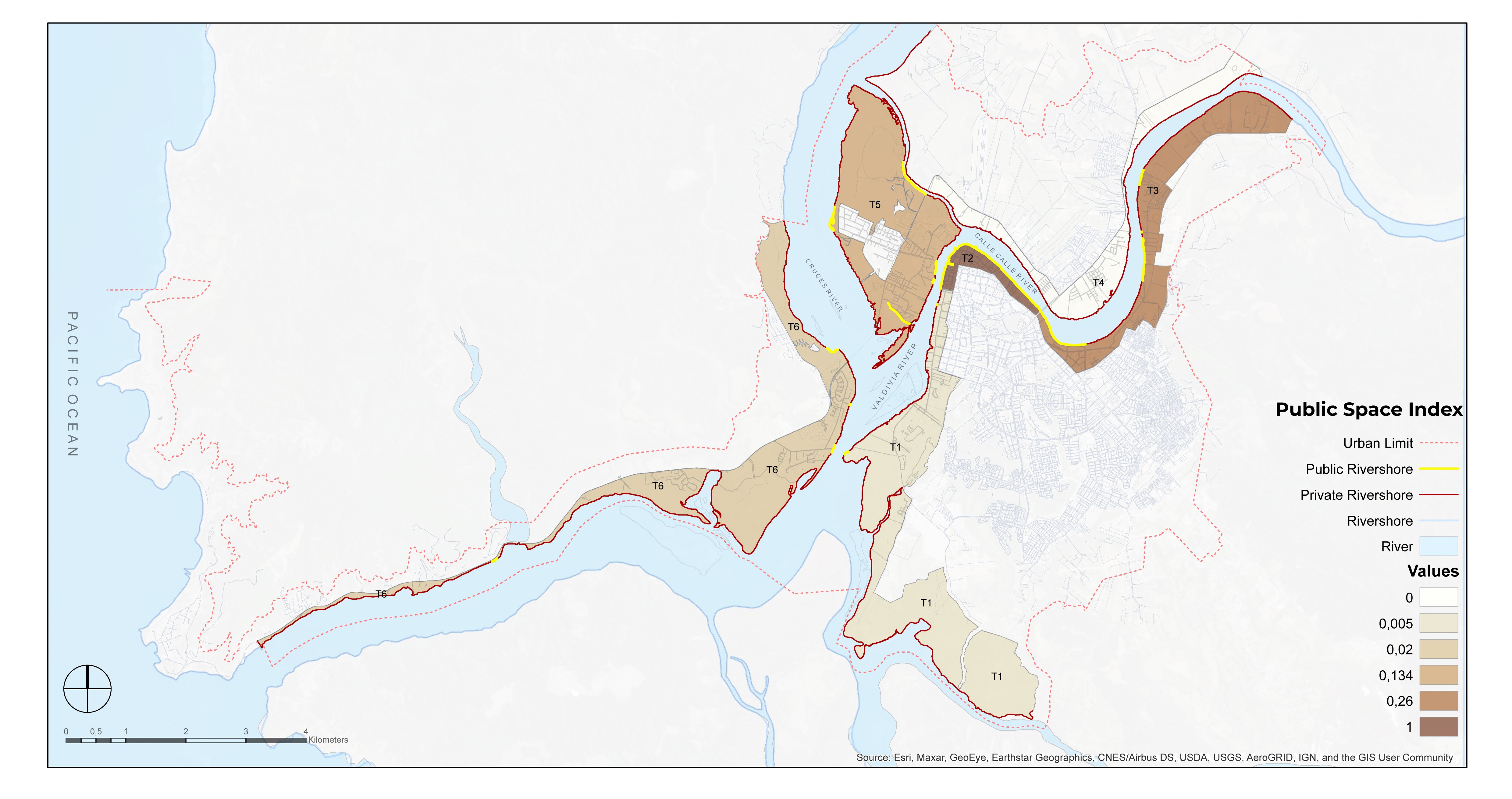 El cruce de datos de distribución socioeconómica de las zonas urbanas de los bordes, junto con metodologías cuantitativas de medición de índices de espacios públicos del borde y acceso al agua -considerando playas, muelles- arrojó interesantes resultados.