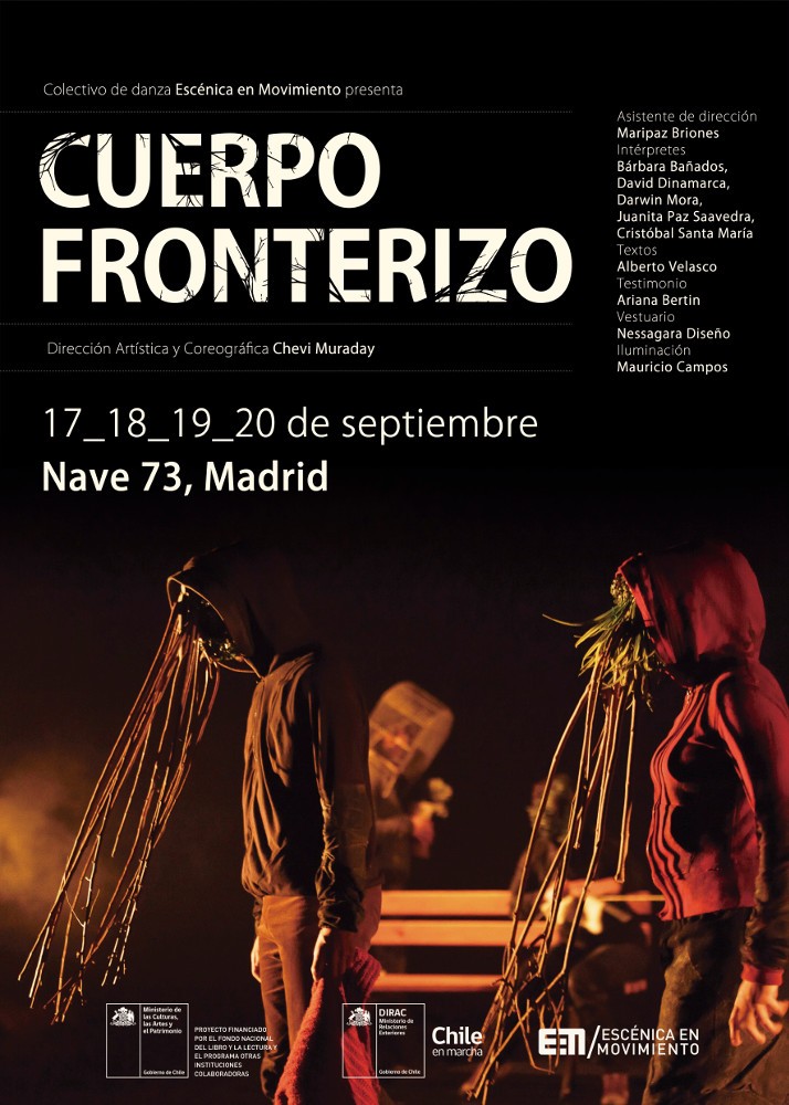 “Cuerpo Fronterizo” tendrá una temporada de cuatro funciones en NAVE 73, en la ciudad de Madrid, desde el martes 17 al viernes 19 de septiembre, a las 20:30 horas; y el día sábado 20, en horario de las 20:00 horas. La obra es para mayores de 12 años y las entradas puede ser adquiridas en forma anticipada y en taquilla del espacio cultural. Para mayor información, ingrese a http://www.nave73.es/portfolio-item/cuerpo-fronterizo/ y a las plataformas digitales del Centro Cultural Escénica en Movimiento www.escenicaenmovimiento.cl y www.facebook.com/escenica.enmovimiento/