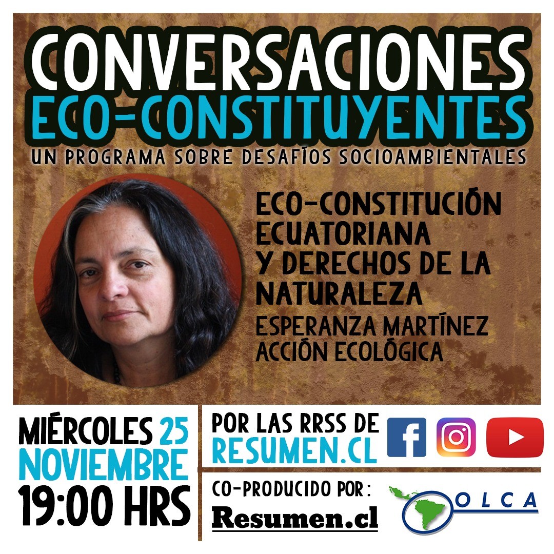 [resumen.cl] En el segundo capítulo de "Conversaciones Eco-Constituyentes" entrevistaremos a Esperanza Martínez, integrante de Acción Ecológica, sobre el proceso de eco-constitución desarrollado en Ecuador y el concepto de derechos de la naturaleza.