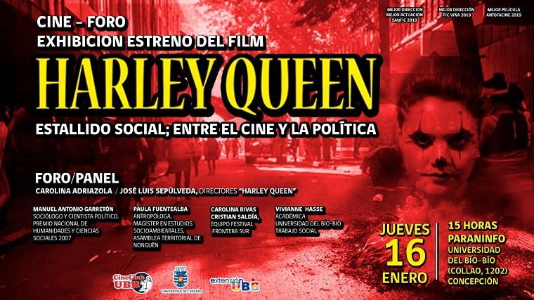 [resumen.cl] Durante este jueves 16 de enero se realizará el Cine-Foro "Estallido Social entre el cine y la Política" en donde se presentará el filme Harley Queen de los/las destacadas directoras Carolina Adriazola y José Luis Sepúlveda. La actividad se realizará en el Parainfo de la Universidad del Biobío a las 15 horas.
