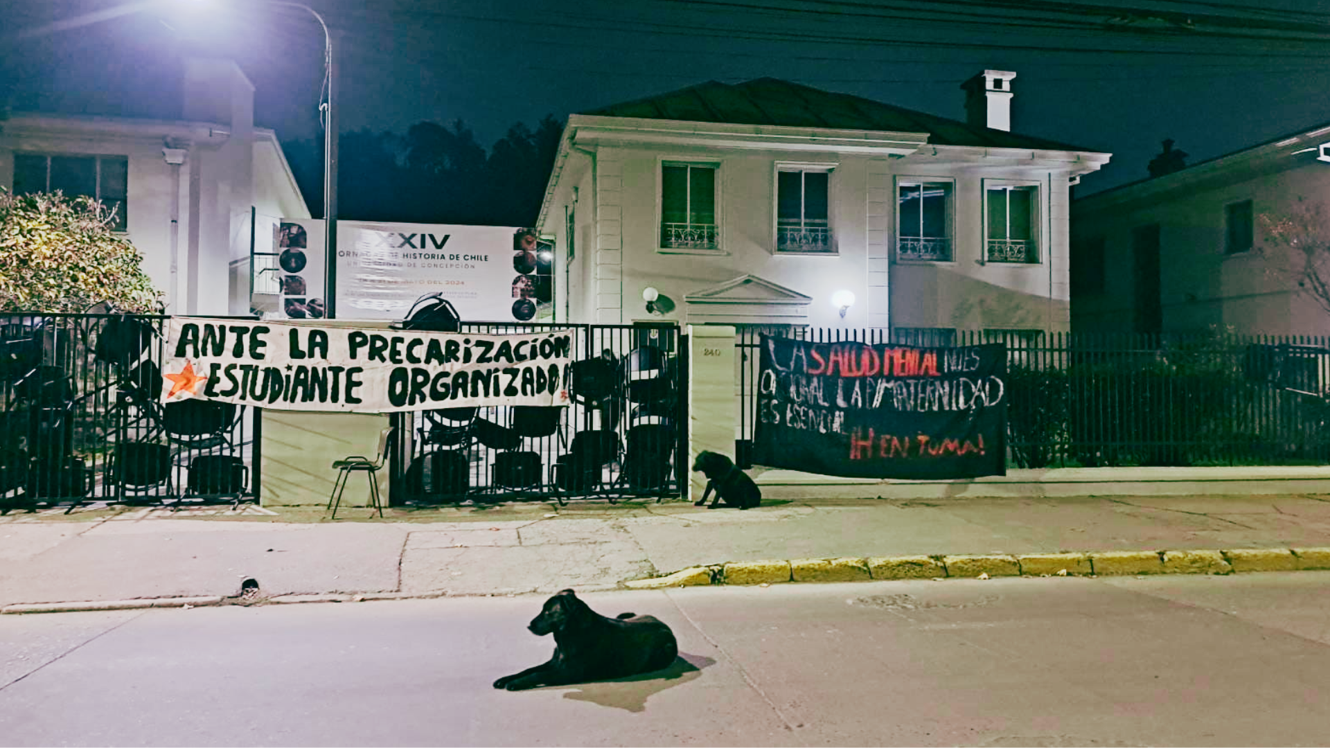 "La salud mental no es opcional. La P/Maternidad es esencial. ¡H en Toma!". Eso se lee en un lienzo colgado en las rejas del Departamento de Historia de la Universidad de Concepción desde la mañana de este domingo. Y es que estudiantes de la carrera de Pedagogía en Historia y Geografía ocuparon el espacio ante lo que denuncian como "inoperancia y abandono por parte de la universidad hacia el estudiantado y bajo el contexto del reciente fallecimiento de un compañero de nuestra carrera, así como la discriminación y violencia ejercida hacia el alumnado".