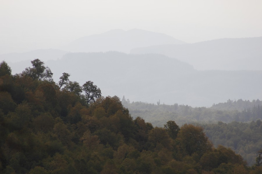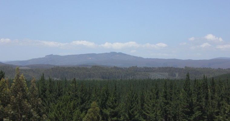 Cerros y valles de la Cordillera de Nahuelbuta cubiertos con monocultivos de pino y eucalipto, vistos desde la ruta hacia Ramadillas.