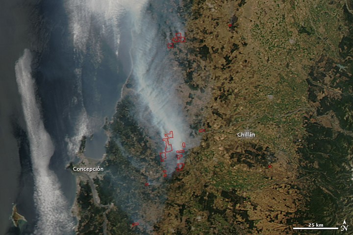 Imagen satelital de los negaincendios en la zona centro-sur de Chile en enero de 2017, capturado por el Espectroradiómetro de Imágenes de Media Resolución. MODIS, NASA.
