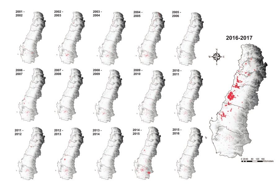 El estudio señala que la distribución del área quemada en el periodo 2001-2017 (ver figura 2) puede ser parcialmente atribuidas a las tendencias de calentamiento y sequía que han jugado un rol en los mega-incendios del Maule, Biobío y Araucanía en 2016-17 y los incendios de China Muerta y la Reserva Nacional Malleco y el Parque Nacional Tolhuaca en la región de la Araucanía en 2015 (ver figura 3).