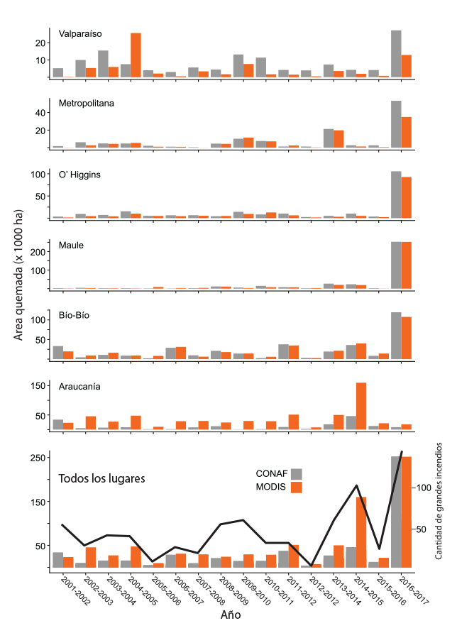 Figura 4. Área total quemada para cada región, por año. Área quemada por año a lo largo de las regiones administrativas basadas en los datos de CONAF (barras grises) y el sistema satelital MODIS (barras naranja). Cabe señalar que la escala varía para cada región. El área total quemada para todos los distritos basados en datos de CONAF y MODIS en el panel inferior. El número total de grandes incendios (mayores de 200 hectáreas) por año en los datos de CONAF son indicados en la línea negra. Fuente: DB McWethy, 2018