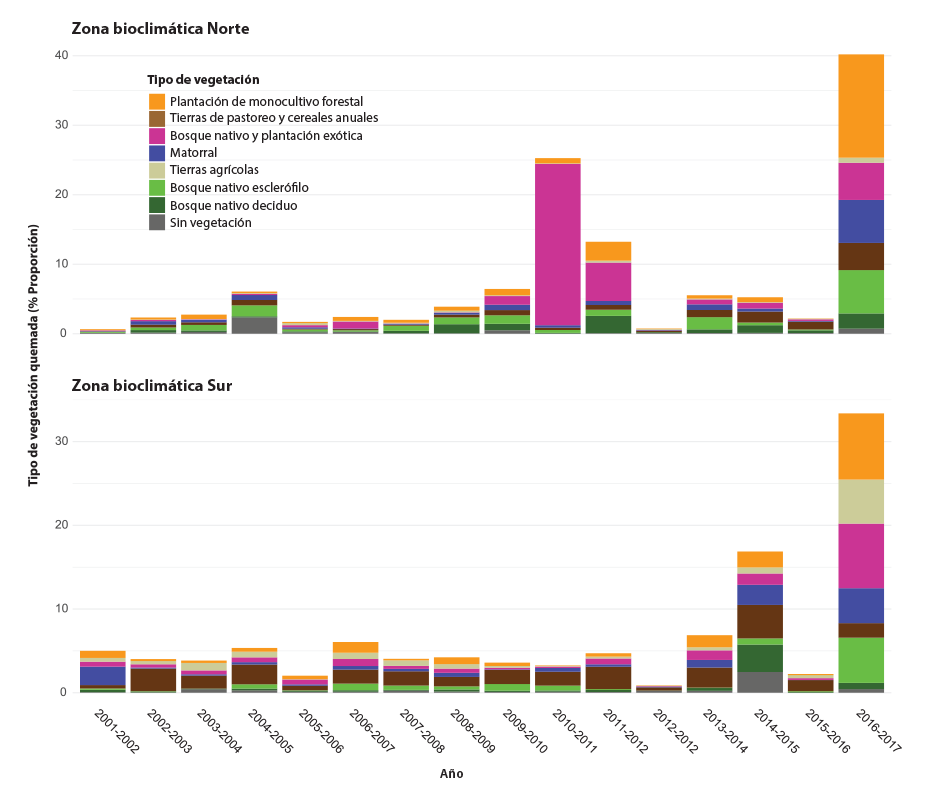 En la seca zona bioclimática norte entre la región de Valparaíso y el norte y centro del Maule, la proporción del promedio de área total quemada cada año según el registro satelital MODIS fue más grande en matorrales, pastizales y plantaciones forestales. Mientras tanto que en la zona bioclimática sur entre la costa y el sur del Maule y La Araucanía, la proporción de área quemada fue más grande en plantaciones forestales introducidas, pastizales, y cultivos de cereales anuales, bosques nativos deciduos y matorrales. (ver figura 5)