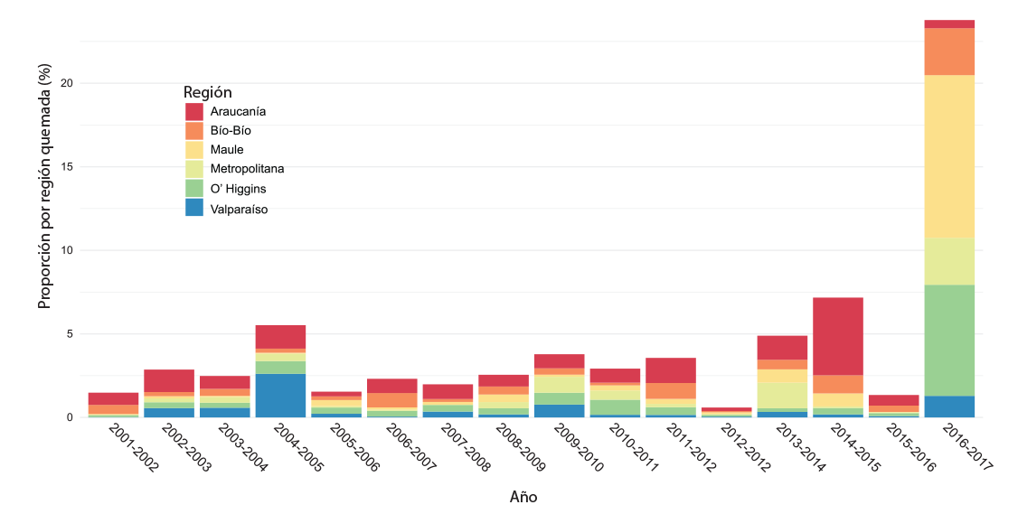 Los resultados del estudio indicaron que el promedio anual y la superficie total de aérea quemada en el periodo 2001-2017 fue mayor en las regiones de la Araucanía, el Biobío y el Maule. Los incendios del periodo 2001-2017 quemaron una alta proporción de la región de la Araucanía en comparación con otras regiones excepto para el periodo 2016-2017 donde la temporada dejó un alto porcentaje de superficie quemada por los incendios en las regiones del Maule, O'Higgins, Biobío y Metropolitana. (ver figura 6)