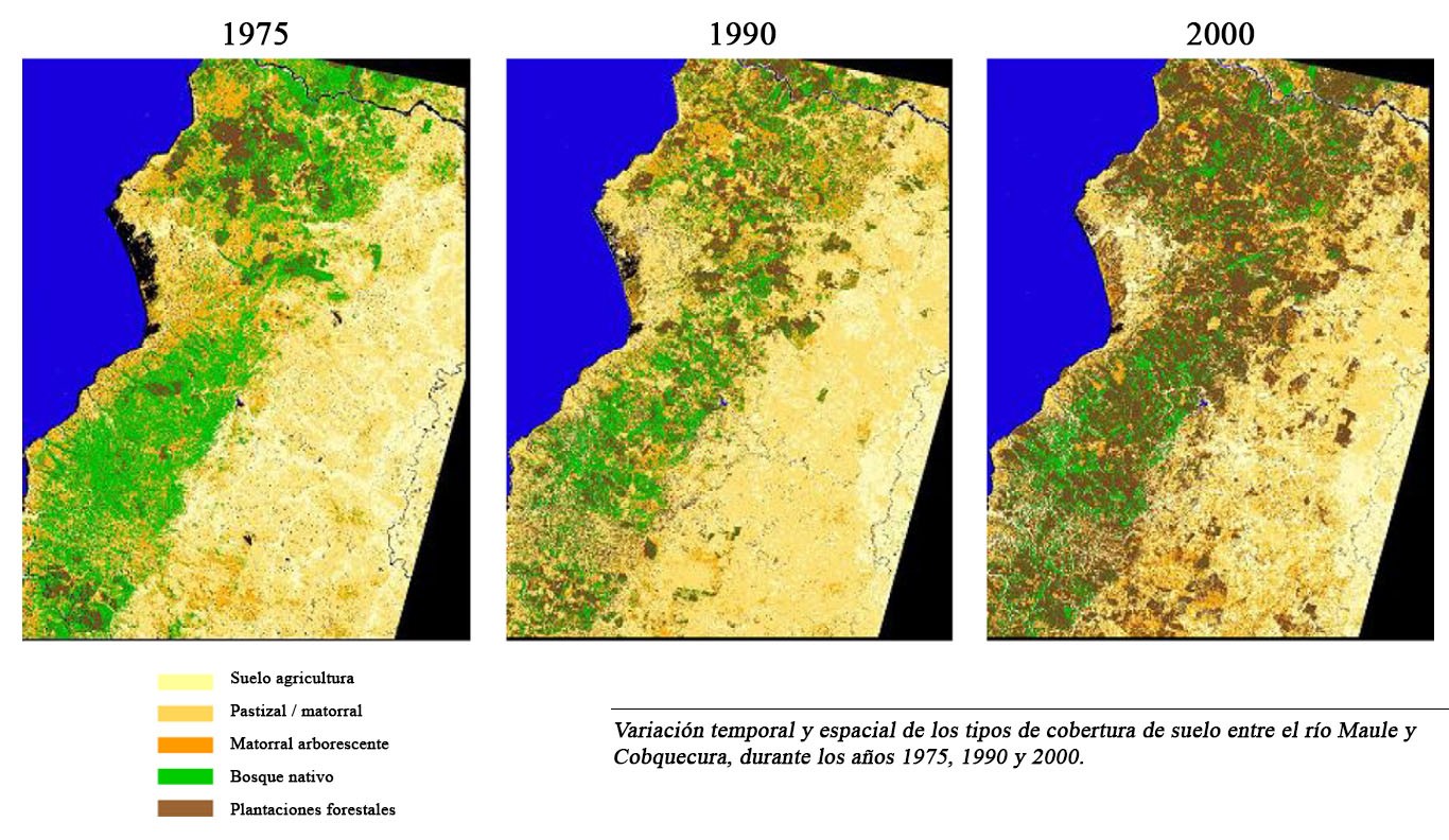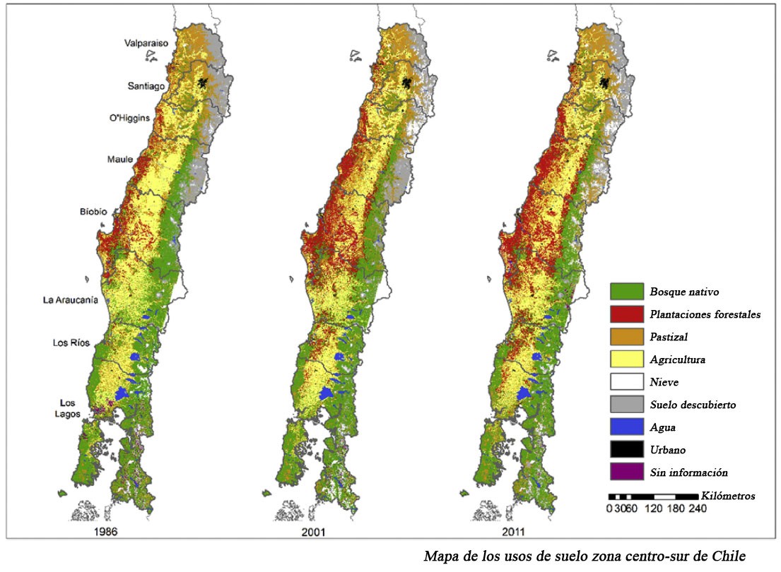 [caption id="attachment_36438" align="aligncenter" width="1105"]Un 14.3% de bosques en Maule, 12.6% Bio-Bio y 11.1 %, de la Araucanía fueron convertidas a plantaciones forestales entre 1986 y 2011. Otras estimaciones anteriores indican que entre 1974 y 1992 fueron sustituidas más de 200 mil hectáreas de bosque nativo en Chile; que en las regiones del Maule y del Biobío 48 mil hectáreas de bosque nativo fueron reemplazadas por plantaciones de Pinus radiata durante el período 1978-1987; y que en la Región de los Ríos, el 48.8 % de las plantaciones efectuadas entre 1981 y 1993 (1,902 hectáreas) fueron establecidas sobre áreas anteriormente cubiertas por bosque nativo. En 1992, se estimaba que en Chile anualmente desaparecían 6.195 hectáreas de bosques debido a su sustitución por plantaciones