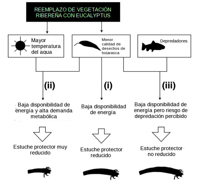 [caption id="attachment_39901" align="aligncenter" width="687"]Estos efectos letales y subletales de Eucalyptus, están mediados por la pobre calidad y la toxicidad de la hojarasca que entra en los cursos de agua que fluyen a través de plantaciones forestales. Este ambiente influenciado por Eucalyptus, reduce significativamente los recursos disponibles y puede comprometer importantes funciones biológicas. Los experimentos demuestran que la reducción en la calidad de la hojarasca y el incremento de la temperatura, dos agentes de estrés que actúan en conjunto en ríos, pueden modificar el destino de la energía disponible en larvas de Sericostoma, afectando su crecimiento. La mayor parte de este proceso ocurre cuando los riesgos de depredación son altos y la energía disponible es usada en la construcción de estuches protectores.