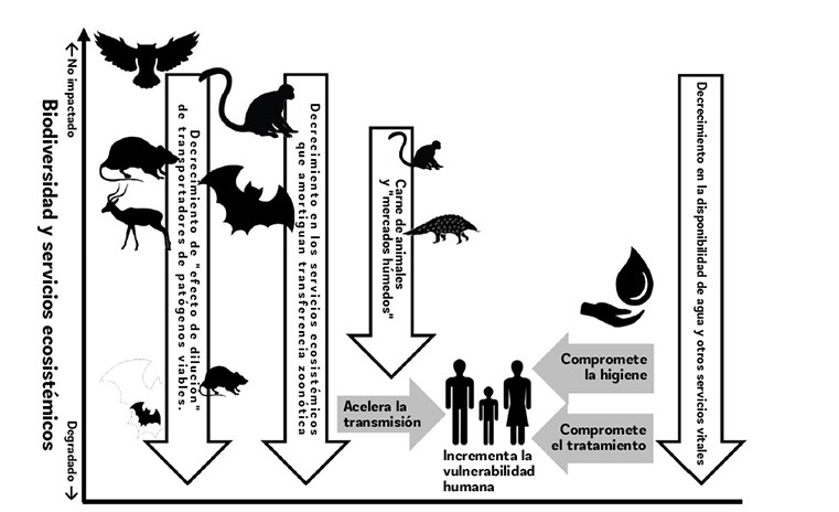 La degradación de servicios ecosistémicos incrementa la probabilidad de transferencia zoonótica mientras que la disminución del agua y de otros recursos vitales reducen la capacidad de tratamiento para enfermedades. Fuente: https://doi.org/10.1016/j.envsci.2020.05.017
