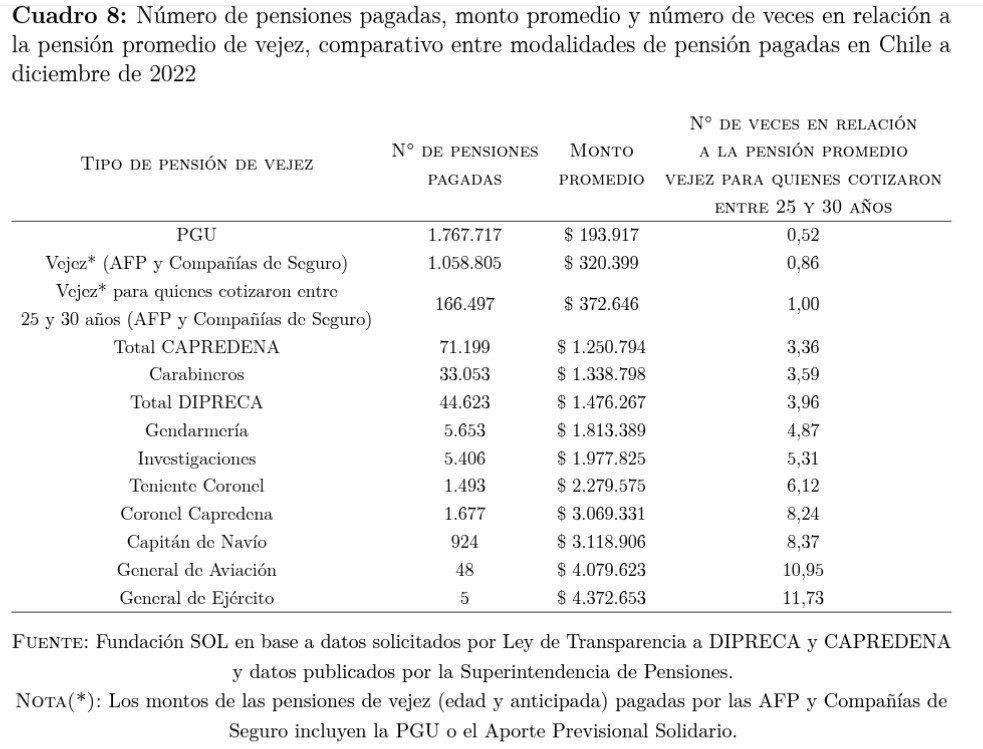 Y es que tras la dictadura cívico-militar, estos grupos -militares y Fuerzas de Orden- mantuvieron un sistema de cajas previsionales, mientras que el resto de la población debió migrar forzosamente al modelo de capitalización individual que hoy entrega míseras pensiones a millones de personas.