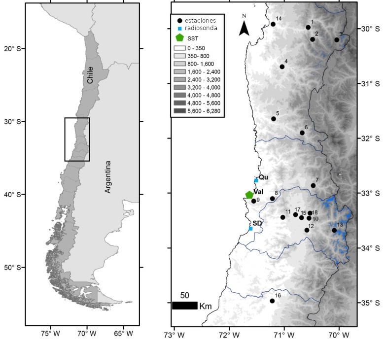 El estudio se centró en la zona central de Chile entre los años 1979 a 2015 debido a la disponibilidad de datos confiables para las estaciones terrestres durante este periodo. Se analizaron datos desde 18 estaciones en un corredor longitudinal de 200 km desde la costa hasta la zona cordillerana. Los datos de la estación se complementaron con mediciones de radiosonda, un dispositivo usado en globos meteorológicos para medir parámetros de la atmósfera y transmitirlos a un aparato receptor fijo en Quintero y Santo Domingo, en la región de Valparaíso.