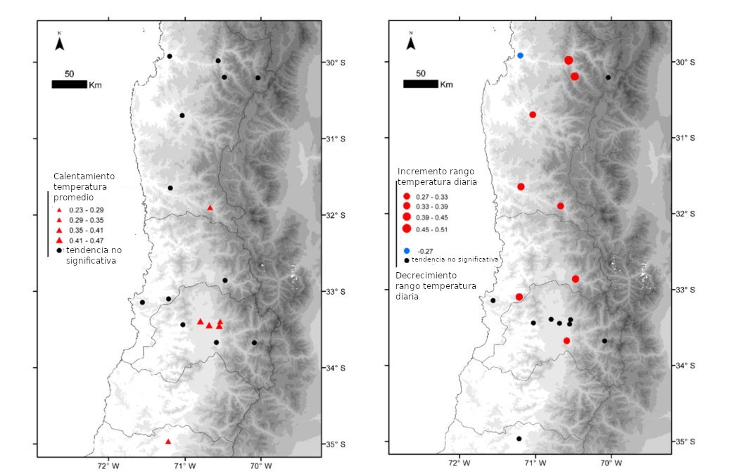 Fueron analizadas tendencias de temperatura desde 18 estaciones de medición y sondas meteorológicas entre los 30° y 35° en Chile central en el periodo 1975-2015. Se evaluaron tendencias de temperatura en zonas geográficas durante las estaciones del año, y usaron índices climáticos regionales oceánicos y atmosféricos
