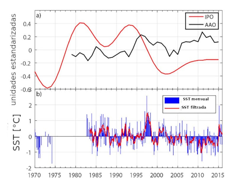 Superior: 11 años de promedio móvil filtrado para el Índice de Oscilación del Pacífico (IPO) y la Oscilación Antártica (AAO) para el periodo 1970-2015. Inferior: Anomalías mensuales de la temperatura superficial del mar (SST, por sus siglas en inglés) en Valparaíso en el periodo 1970-2016 (barras azules) y una media móvil de 5 meses filtrada (línea roja). Fuente: F. Burger et al. 2018