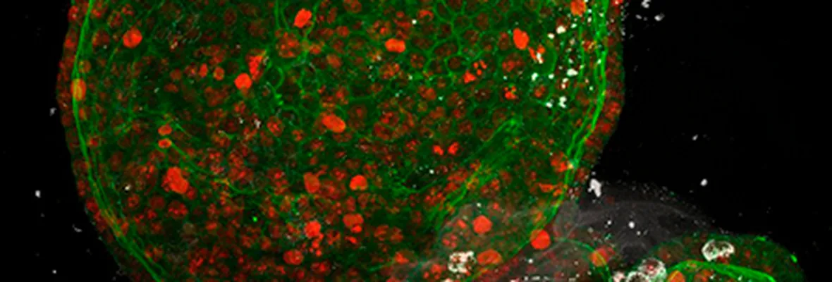 [caption id="attachment_78460" align="alignnone" width="446"] "Mini órgano" de intestino humano infectado con SARS-CoV-2 (blanco) Foto: Joep Beumer/ Grupo Clevers / Instituto Hubrecht. Extraída de https://www.nature.com[/caption]