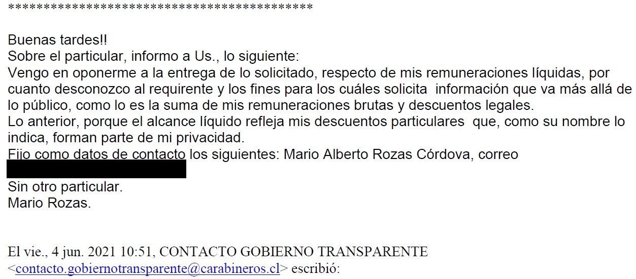 Por su parte, Eduardo Gordon Valcárcel, general director bajo el primer gobierno de Bachelet y los dos primeros años del gobierno de Piñera, donde fue el rostro visible de la represión a las legítimas protestas de los movimientos sociales, se opuso a la solicitud planteando el desconocimiento del uso que tendría la información pese a que la remuneración fue recibida mientras era un funcionario público, agregando que esta "forma parte de mi privacidad".