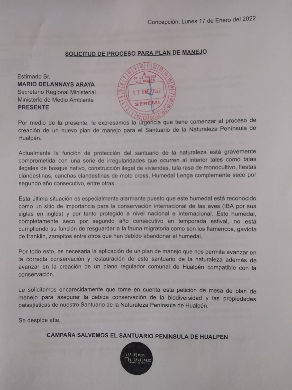 Carta entregada en la Seremi de Medio Ambiente por integrantes de la campaña Salvemos el Santuario de Hualpén