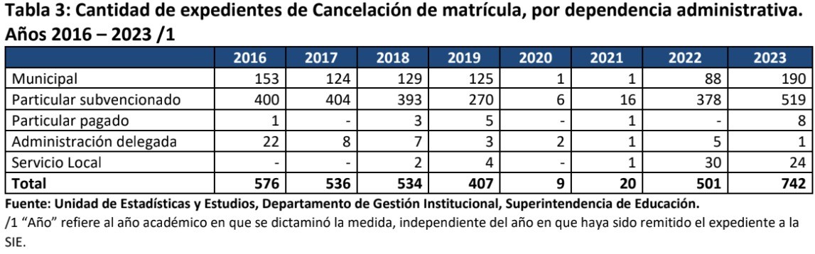 En el caso de la cancelación de matrícula el panorama no es muy diferente, aunque se evidencia su uso amplio y frecuente por parte de la administración particular subvencionada. En 2016 la cifra alcanzaba a los 576 expedientes, siendo 400 de casos de particulares subvencionados. En su total, la cifra aumentó a 742 expediente para 2023, año en que los establecimientos particulares subvencionados tuvieron no solo un explosivo aumento, sino que casi triplicaron los expedientes de aquellas administraciones municipales, llegando a 519 casos.